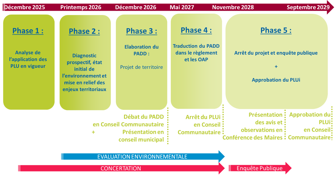 - Phase administrative englobant l’arrêt du PLUi, la consultation des Personnes Publiques Associées, l’enquête publique puis l’approbation finale.