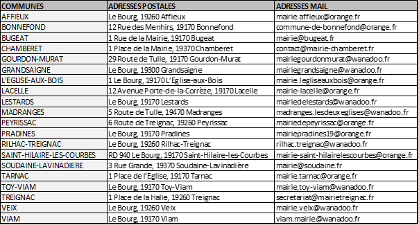 o à l’attention de Monsieur le Président : 15 avenue du Général de Gaulle, 19260 Treignac
