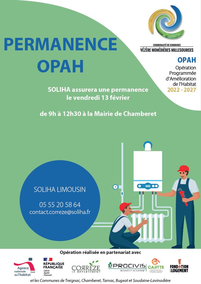 Permanence SOLIHA le vendredi 13 février 2026 de 9 h 00 à 12 h 30 à la Mairie de Chamberet