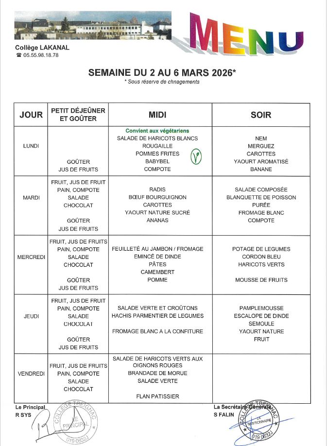 Menu de la cantine scolaire du lundi 2 au vendredi 6 mars 2026