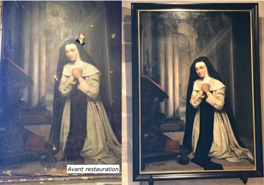 Fondée par Messire Pierre de Pompadour, la chapelle fut construite à l’aide de souscriptions. La première pierre de cet édifice fût posée le 21 Avril 1646 et s'acheva en 1661. L'intérieur de l'église est très sobre. Au-dessus de l'entrée une vaste tribune entièrement fermée par des grillages en bois accueillait les pénitents. Contre la cloison de l'Autel, sur des supports ouvragés se trouvent deux statues de Jean-Baptiste et Saint Joseph. Le tableau central représente le bâptême du Christ par Saint Jean. Il aurait été peint vers 1667. Actuellement deux tableaux sont en restaurations L'Annonciation et la Religieuse en prières. Des travaux d'assèchement ont été également entrepris. |